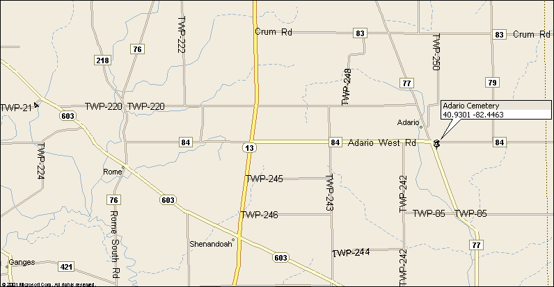 Location: At the corner of County Road 77 and County Road 84 in Butler Twp., Richland Co., Ohio. Behind the Adario United Methodist Church.